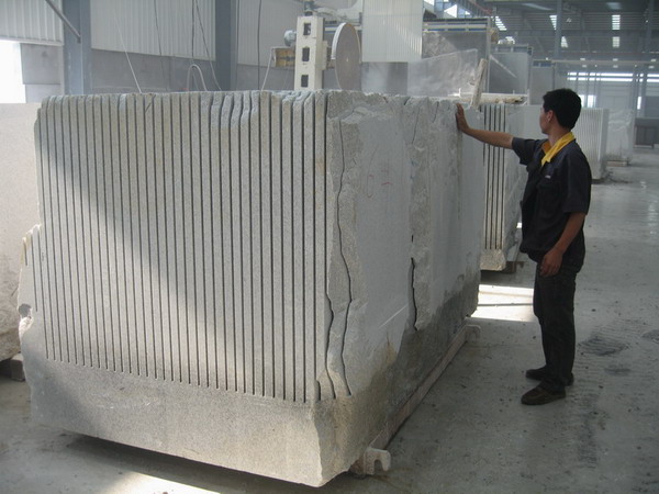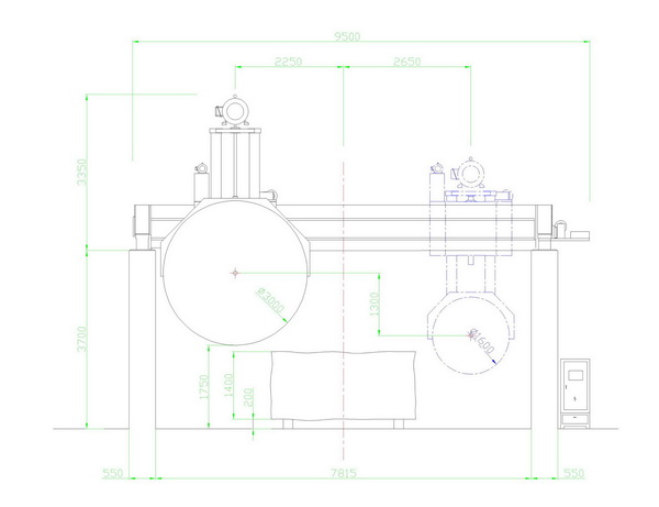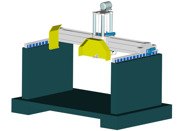 本機采用大跨度橫梁結構, 整體機身重; 橫梁導軌采用進口線性軌道; 機身升降結構采用四立柱式液壓升降, 同時采用專有技術: 立柱及邊梁,在切割時有液壓鎖緊裝置,確保切割時整體機身不晃動, 切割效率好, 板材平整度高, 是切割大規格高價值進口大荒料的理想設備. 1: 機身采用專有技術"液壓鎖緊裝置",在機械有磨損或切割過程中可減小機身間隙,有利于提高板材的平整度和延長刀頭使用壽命 (*選配 Alternative)。